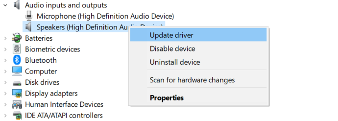 Launching Device Manager by navigating to it in Control Panel Launching Device Manager by running devmgmt.msc - In the device manager, right-click on the speaker under audio inputs and outputs. This will open an options menu.