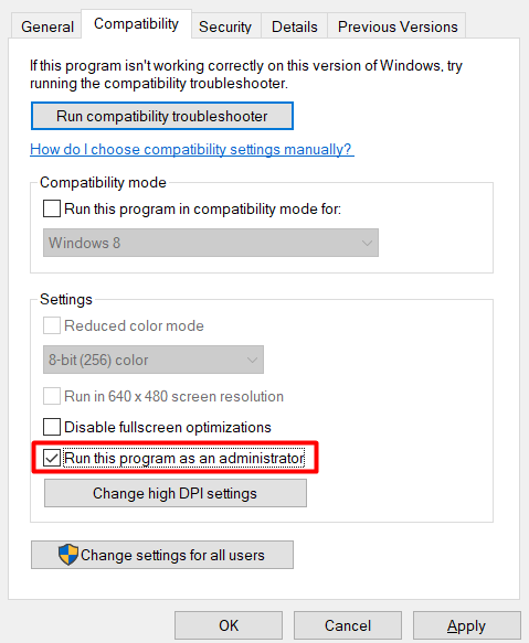 - In the properties window, click on the compatibility tab and check the Run program as administrator option.