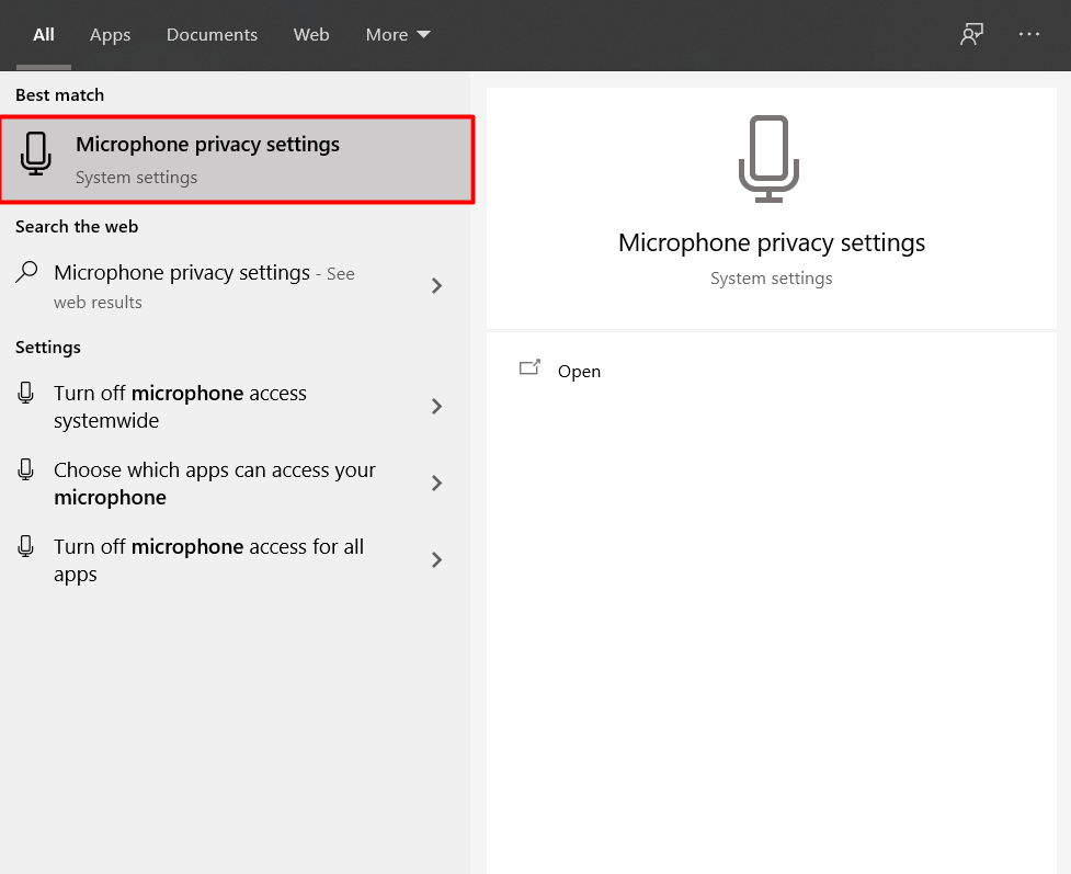 - Press the Windows key and enter Microphone privacy settings in the dialog box.