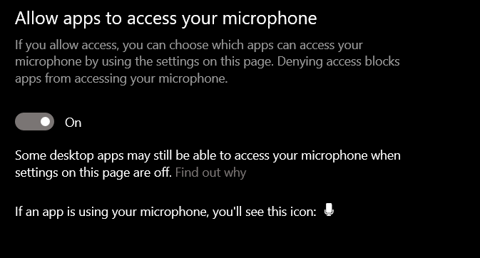 - In the microphone settings, toggle On the Allows apps to access your microphone settings and Allow desktop apps to access your microphone settings.
