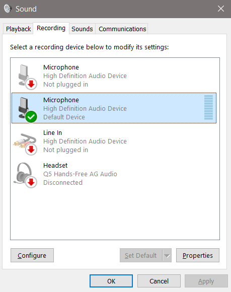 - In the Sound window, open the recording tab and select the correct recording device.