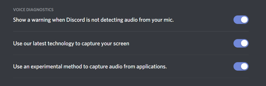 - Navigate to Voice and Video in the sidebar and scroll down to find the use of experimental technology to capture audio for gamesand use of experimental technology to capture your screen.