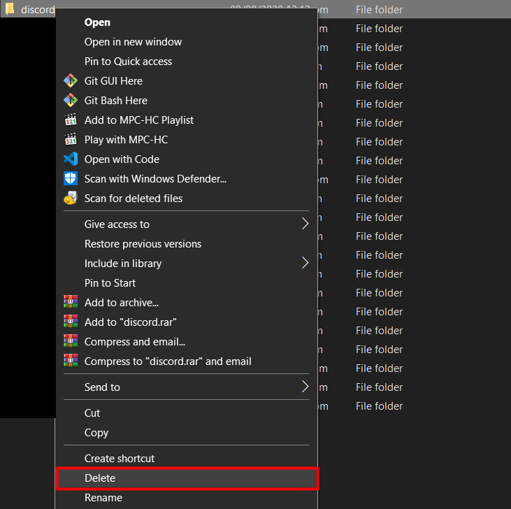 in the dialogue box and hit enter. - In the Roaming folder, navigate to the Discord folder, right-click on it and hit Delete.