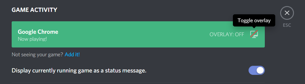 - Toggle the overlay in the game activity to On.