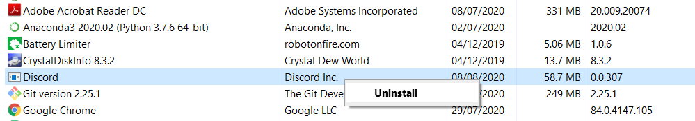 - In the control panel, press D to navigate to the Discord entry, right-click on it and select uninstall.