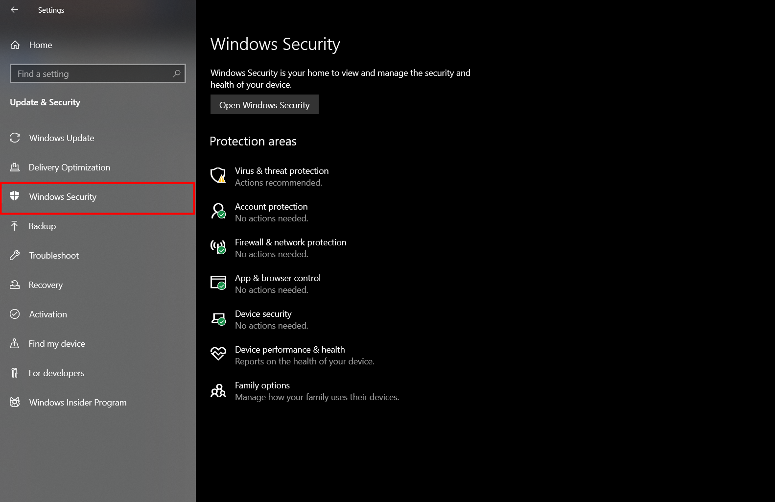 In the settings window, open the Windows security settings and click on ‘virus and threat protection’ under ‘protection areas’.