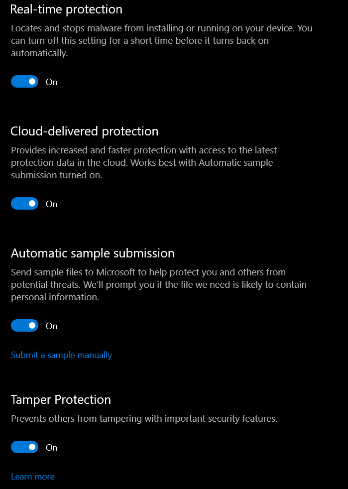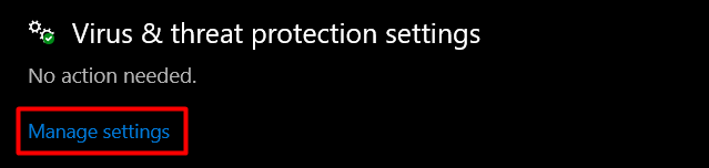This will open a new Window where select manage settings under virus and threat protection settings. Toggle all protection settings to Off.
